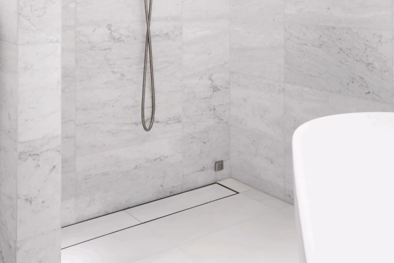 En stilren linjegolvbrunn som anpassar sig till interiören. Snabb, och enkel installation.