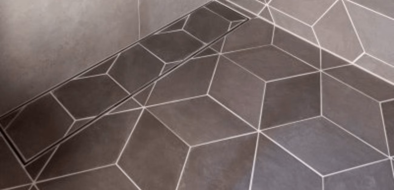 Badrummet på nedervåningen har gråa rombformade plattor som även täcker golvbrunnslocket och får den beklädda Vieser Line-golvbrunnen att smälta in plattornas mönster. Duschens infällda schampohylla med spotlights framhäver väggplattornas enhetliga mönster. Detta möjliggörs av att fallet mot brunnen vid bakväggen går i en riktning så att hela plattor kan användas och golvets mönster kan fortsätta på väggen.