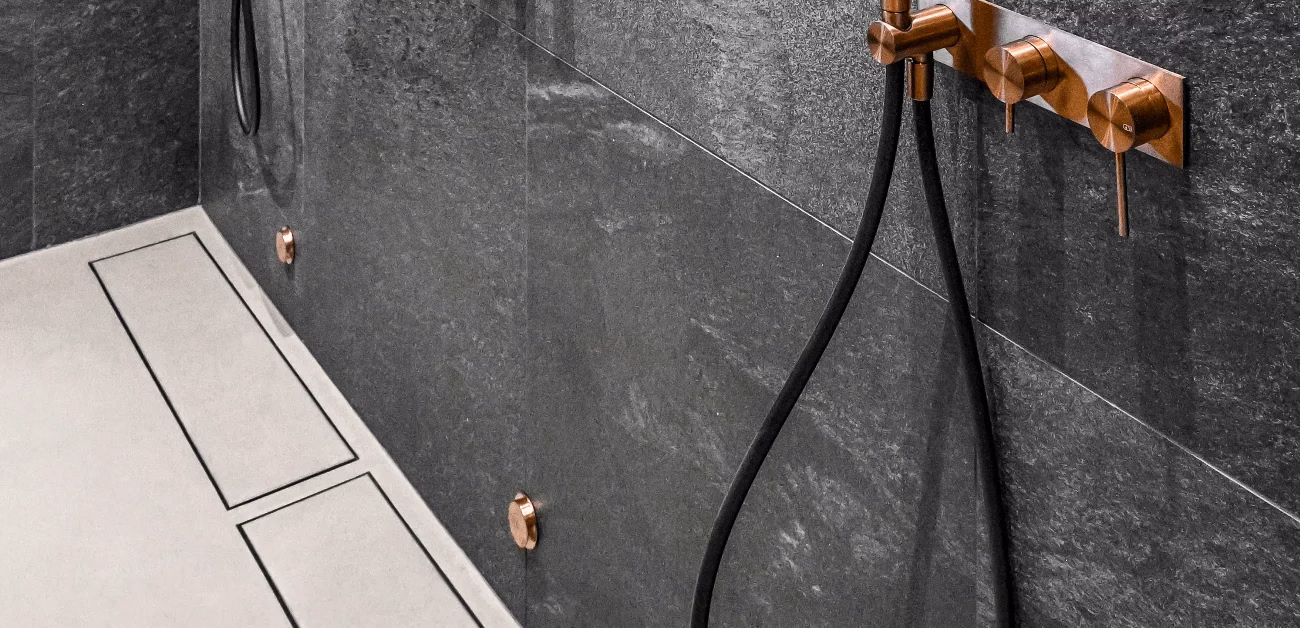 Vieser Line är ett utmärkt val för golv som detta, för golvbrunnslocket går att beklä med klinker eller vilket golvmaterial som helst, till exempel mikrocement, eller som i detta fall med harts.