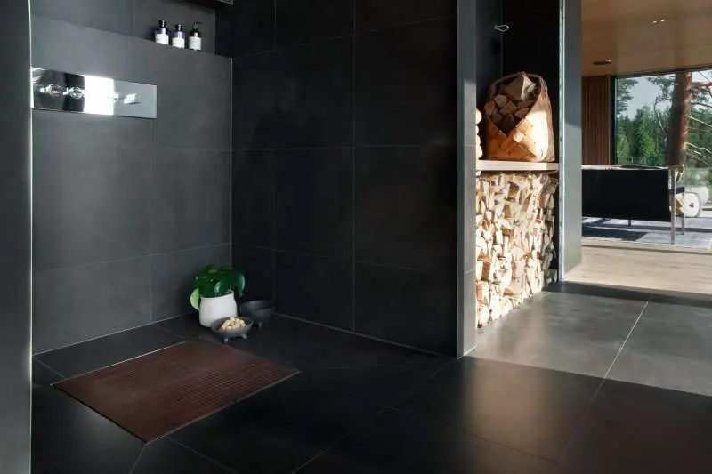 De två badrummen i huvudbyggnaden har Vieser Line-golvbrunnar med silar som kan förses med beklädnadsmaterial efter behag. Både golvet och silen har en yta av ljusgrå mikrocement som tillsammans med den intima belysningen skapar en lugnande och stillsam stämning i duschrummet.