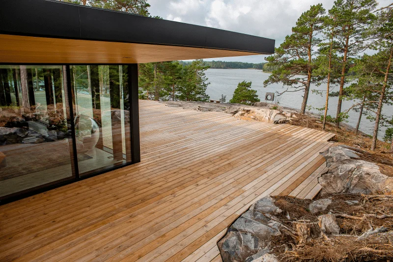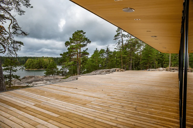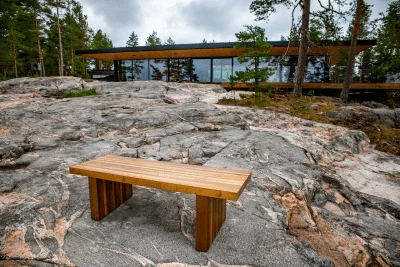 Den separata strandbastun har japanskinfluerad känsla både när det gäller materialen och dekoren. I badrummet fångas uppmärksamheten direkt av Viesers 60 x 60 cm stora fyrkantiga designsil i Kebonyträ. Vieser Square Kebony, Bali Edition är resultatet av ett designsamarbete mellan Lauri Ylönen, Saku Sysiö, formgivare på designbyrån Aivan, och Vieser.