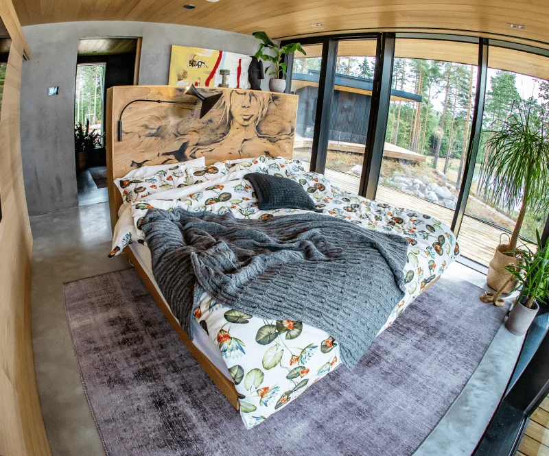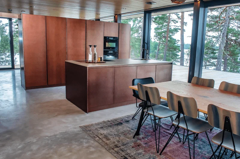 Inredningsdesigner Eveliina Alanne fick göra verklighet av sin egen vision – mörka toner som framhävs med spännande färger och kompletteras av stora fönster och tydliga linjer. Djärva men lyckade val är till exempel kökets arbetsyta i brons och sovrummets stora glasvägg med utsikt över den stora terrassen och ut mot havsviken.