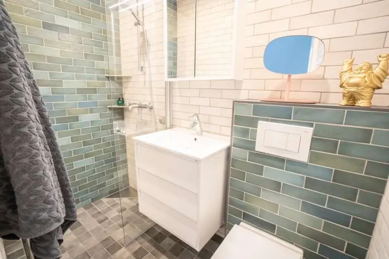 ”Eftersom det är ett gammalt bryggeri är atmosfären lite industriell. Som motvikt till detta ville vi skapa en lugn och fridfull stil i badrummen”, fortsätter Hakala.