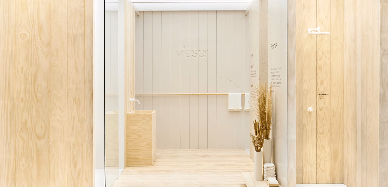 Vår monter med namnet Natural by Vieser gjorde debut på mässan Habitare i Finland i höst. Nu har den utökats med nya element som presenteras i Stockholm. Designern Linda Bergroth har skapat en enkel men elegant monterpaviljong, där en minimalistisk badrumsmiljö i japansk stil badar i varmt naturligt ljus.