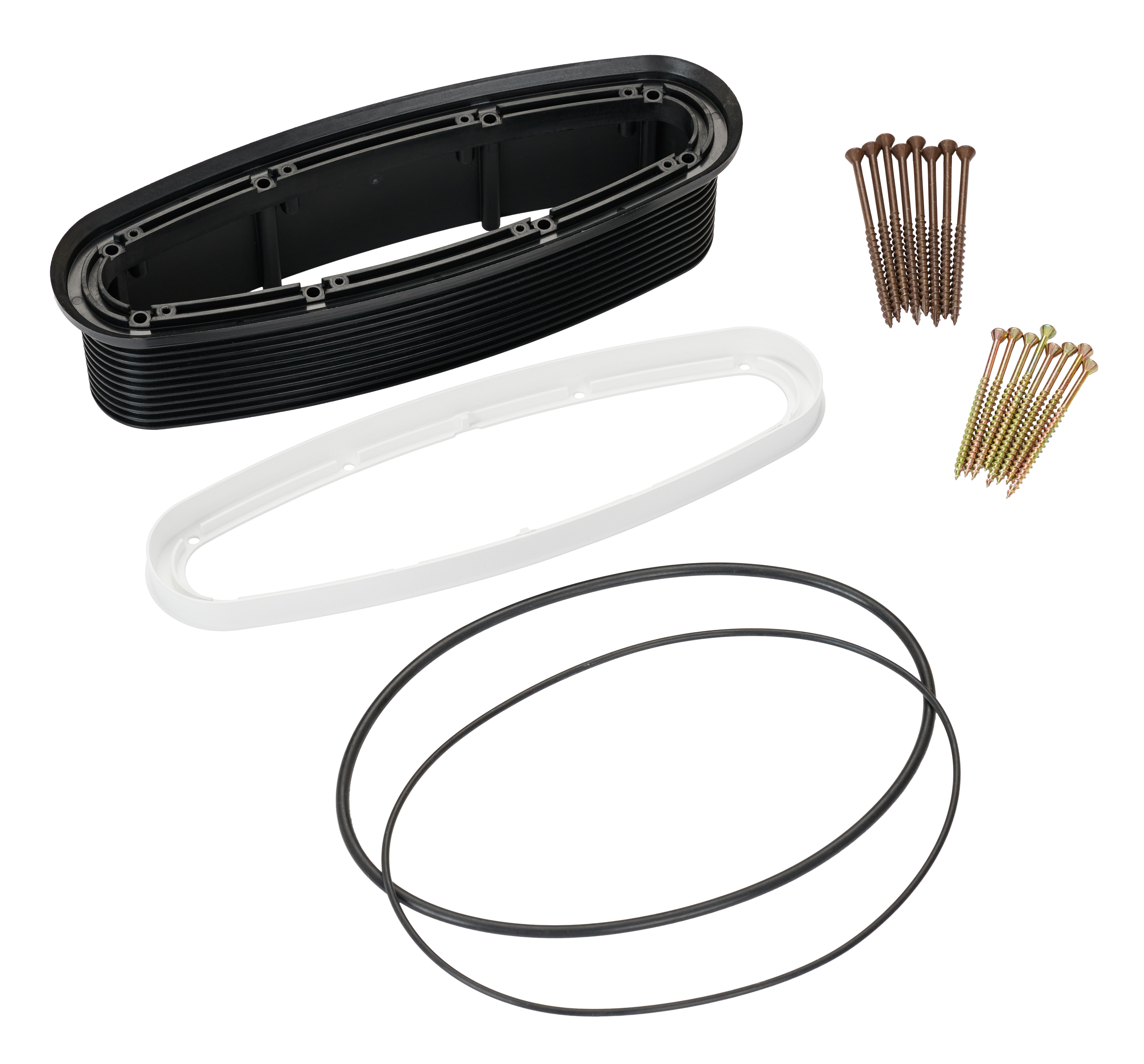 Förpackningen innehåller: förhöjningsring, vit stödring, O-ringspackningar och fästskruvar.