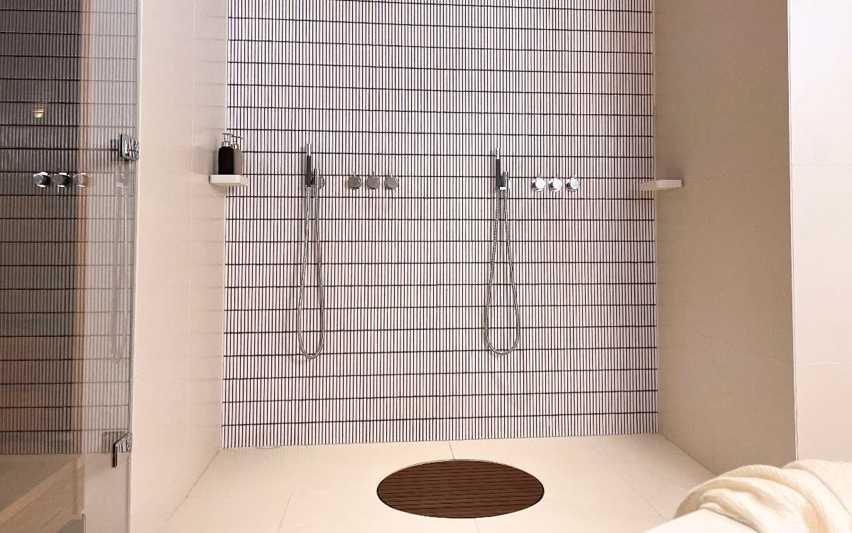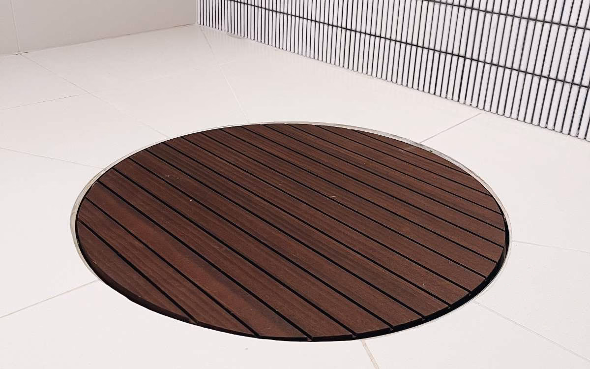 I husets badrum domineras taket av husets karaktäristiska mörka träslöjd, och det ekar underbart på golvet av den träbearbetade Kebony trä Vieser Dot design golvbrunnslock. Runt Vieser Dot har de stora golvplattorna kapats i segment, vilket resulterat i en vacker och jämn kakelfördelning och funktionella rännor.