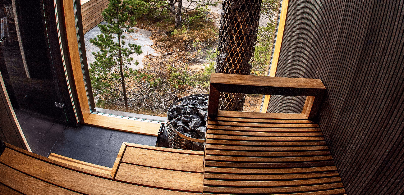 Kakelsättningen av badrum och toaletter i den separata bastubyggnaden upprepar strandklippans randiga mönster, som får plats av badrummets monokroma, stora och enhetliga klinkergolv. I golvet, nästan osynligt finns två Vieser Line -väggnära linjegolvbrunnar som kan kaklats över.
