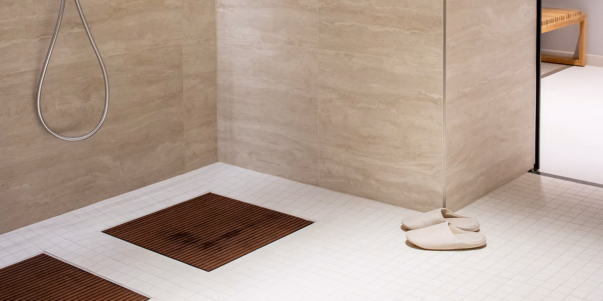 Lägenhetens badrum kompletteras med kaklade Vieser Line golvbrunnar. I den gemensamma spaet matchar tre Vieser Square de vackra trädetaljerna samt de fyrkantiga regnduscharna.
