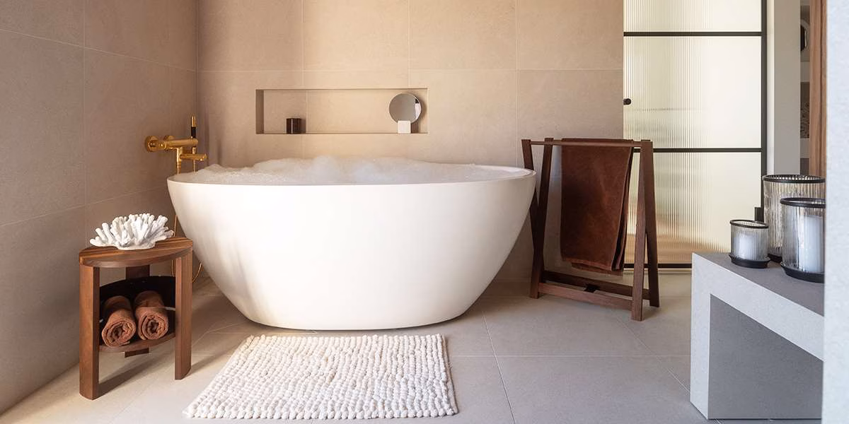 Kaklad Vieser Line smälter in med de stora ljusa golvplattorna och Lauha-produkterna matchar träytorna i badrummet. Läs mer om Lauha produkter här.