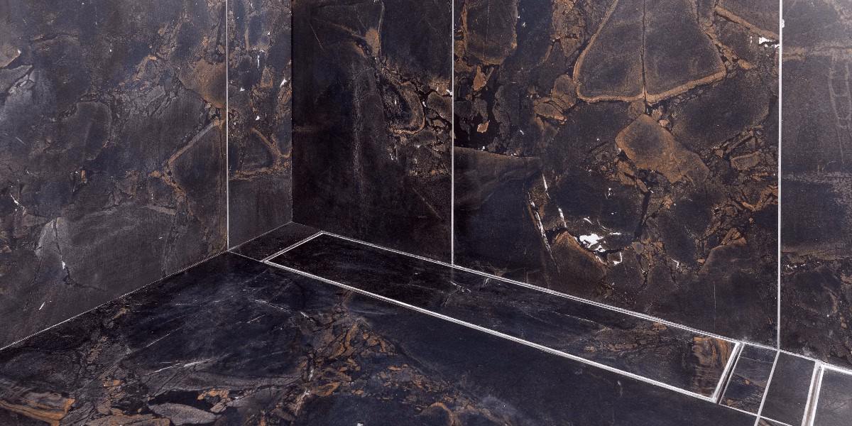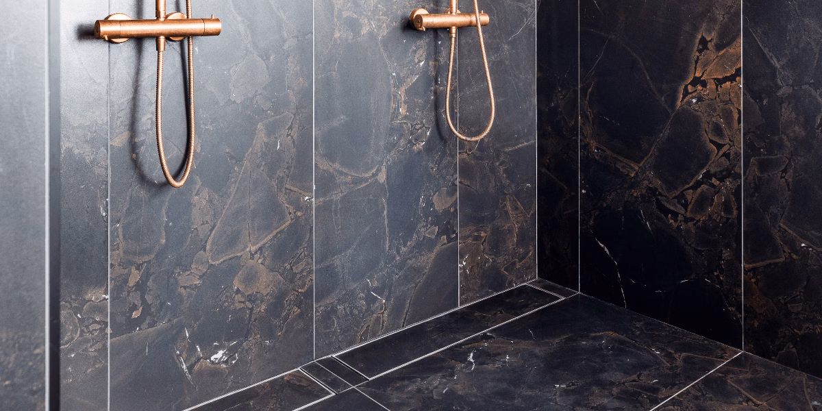 Det mörktonade badrummet i stenhuset Villa Sten är lyxigt och till och med dramatiskt med sina bruna marmormönstrade kakel. Hörnstenarna i badrumsinredningen är två kopparduschar, stora plattor och Vieser Line golvbrunnar som visar plattorna vackert. Det stilrena marmormönstrade klinkergolvet fortsätter från badrummet till grovköket dit valdes Vieser Classic+ svart klinkerram.