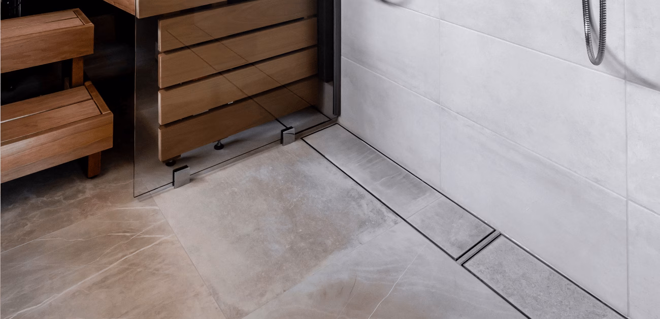 Villa Jukkatalo Tuulia är ett ljust, stilrent och praktiskt hem. Badrummet på första våningen är fyllt med neutrala färger och jordnära materialval som skapar en lugn och avkopplande atmosfär. Vieser Line golvbrunnar valdes för att få ett enhetligt golv.