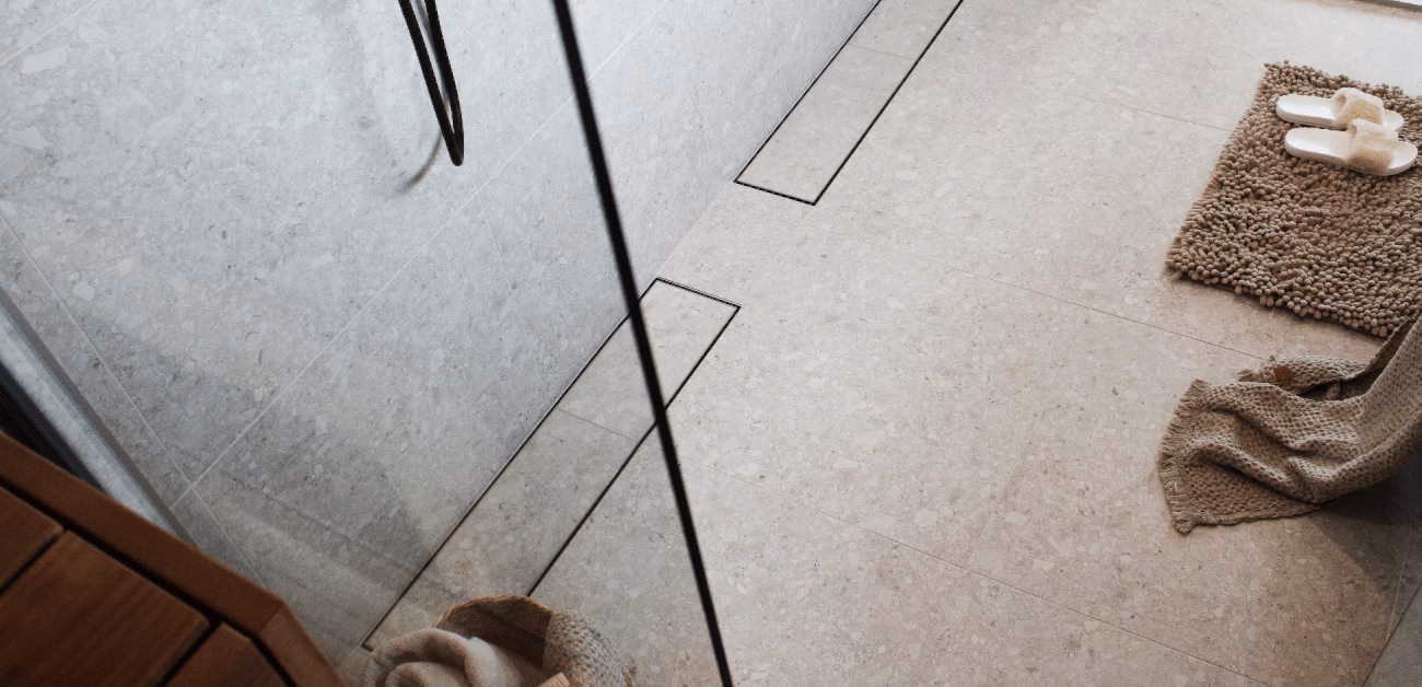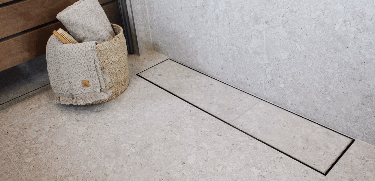 I designen av badrummet för en barnfamilj har fokus legat på såväl funktionalitet som estetik. Två Vieser Line linjegolvbrunnar finns under de svarta duscharna i det ljusa badrummet. De kakelbara Vieser Line gör att golvbrunnen smälter fint in i helheten.