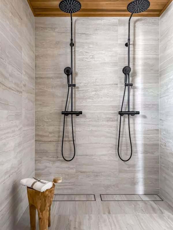 Vieser Line smälter in perfekt i badrumsinredningen, där svarta blandare skapar en spännande kontrast mot den i övrigt stillsamma inredningen med naturliga nyanser.