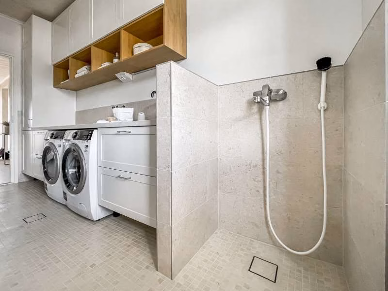 Klinkerplattor döljer golvbrunnarna i det ljusa badrummet och får dem att smälta in i inredningen. Vieser Line har dessutom en utmärkt flödeskapacitet och långt rengöringsintervall som garanterar familjen en problemfri vardag även i badrummet.
