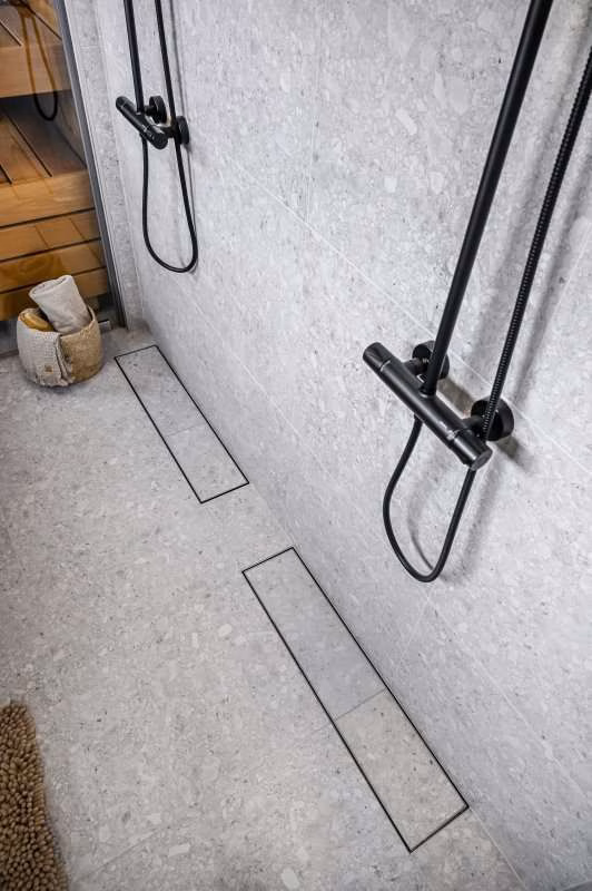 Vieser Line är ett utmärkt val för golv som detta, för golvbrunnslocket går att beklä med klinker eller vilket golvmaterial som helst, till exempel mikrocement, eller som i detta fall med harts.