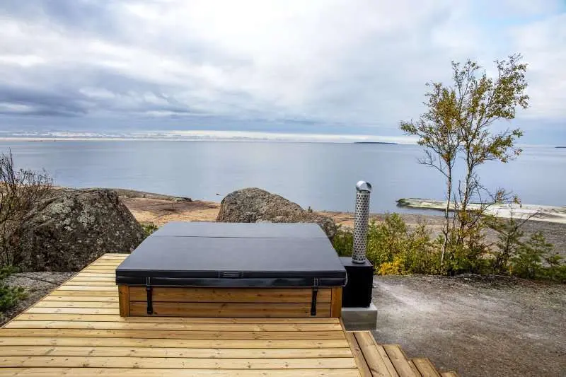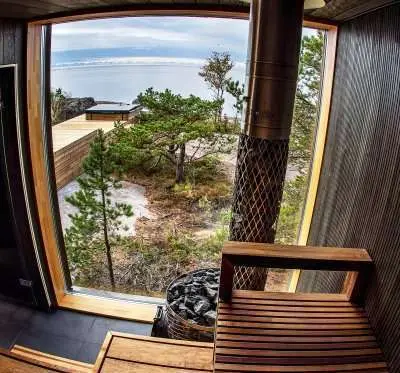 Bastun och badutrymmena placerades avskilt för en så lugn och avkopplande upplevelse som möjligt. De stora fönstren ger en känsla av att skärgårdsnaturen, havet och strandklipporna är en del av huset. Kaklet i badrummet och toaletterna har samma randiga mönster som strandklipporna, vilket accentueras av badrummets stora, enfärgade och oavbrutna golvyta. Nästintill osynliga i golvet finns två kakelbeklädda Vieser Line-golvbrunnar.