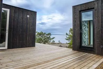 Denna unika fritidsbostad som presenterades i Design by Lauri på finska TV5 tillverkades av moduler på fabrik och transporterades till skärgårdsholmen Rankö som färdiga containerelement. Den moderna stugan är designad av Lauri Ylönen för att smälta in i holmens klipplandskap och är sparsamt inredd i skandinavisk stil.