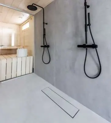 Förutom mikrocement kan Vieser Line även bekläs med valfritt kakel och är därför ett idealiskt val för alla som önskar sig ett tidlöst elegant badrum med en enhetlig stil. Ett tredje alternativ är en elegant mattsvart sil av pulverlackerat rostfritt stål.